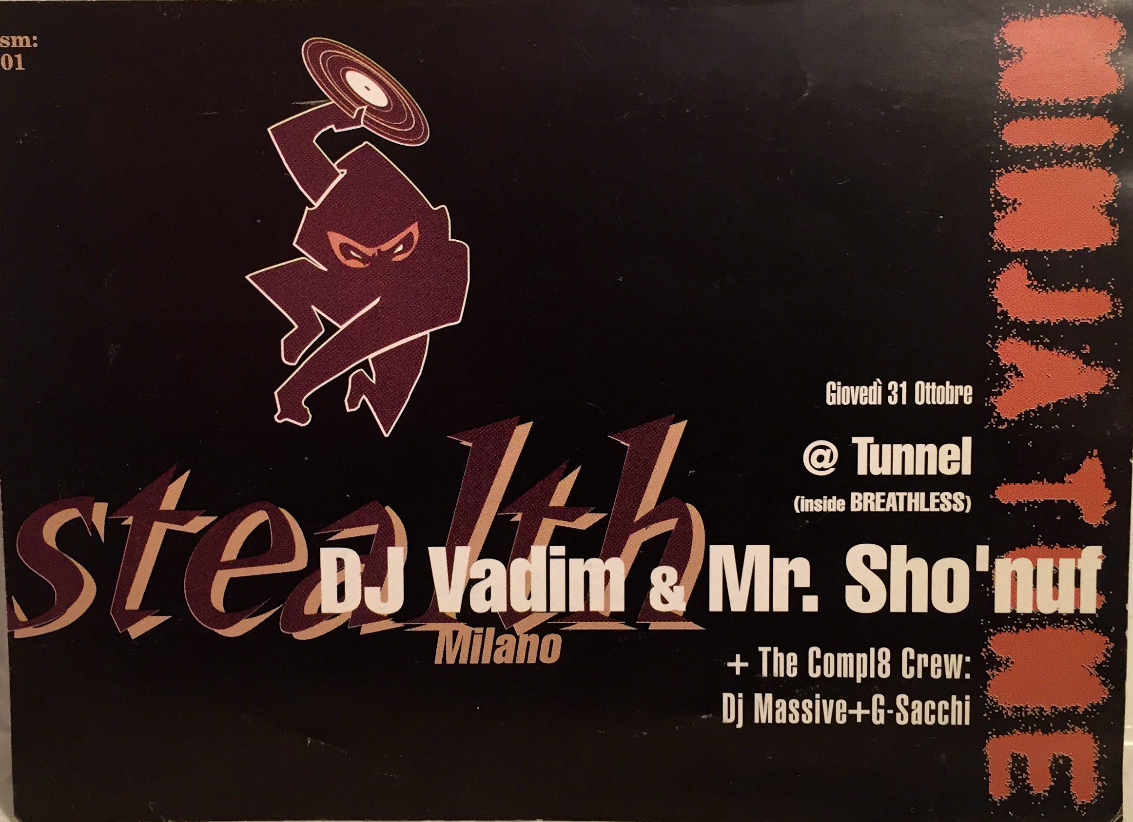 Nel 1994/95 tutto ha iniziato a prendere forma e nell’ottobre del 1995 ho avuto la mia prima residenza (al neonato Tunnel) e le mie prime serate pagate. In quel periodo la “novità” era il breakbeat, il nu-funk e il drum’n’bass. Tutti i suoni dal ritmo spezzato. Suonavo le produzioni della Ninja Tune, Mo’ Wax, Talkin’ Loud, Wall Of Sound ecc….. I primissimi Chemical Brothers (ancora addirittura Dust Brothers!) e ovviamente il drum’n’bass, dalla Moving Shadow alla Metalheadz, dalla V recordings alla Ram ecc….. Sembrava un suono sbarcato all’improvviso da una nave aliena.